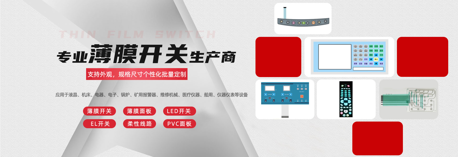 專業生產各種電子薄膜開關;LED燈開關、PET/PC/PVC面板等電子配件。廣泛應用于多個行業。